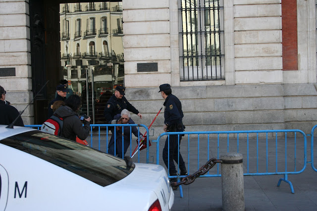 Parece ser que Angustias iba desde la Plaza de Celenque, ya desalojada en la madrugada por la UIP hasta Sol para reunirse con miembros de la Plataforma Stop Deshaucios que están allí acampados.