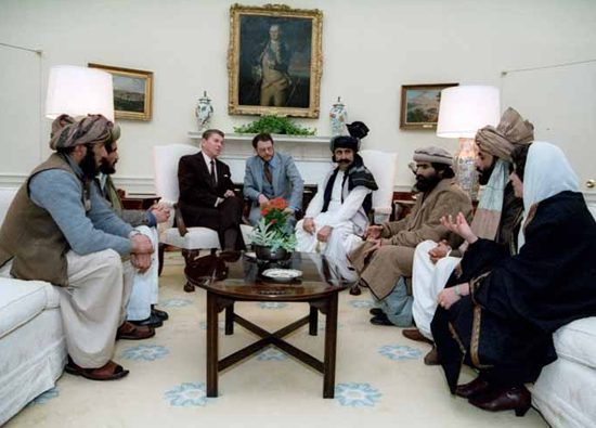 Ronald Reagan recibe en la Casa Blanca a líderes muyahidines (Talibanes, rebeldes en Afganistán) a los que consideró “una inspiración para los que aman la libertad”. (1983).